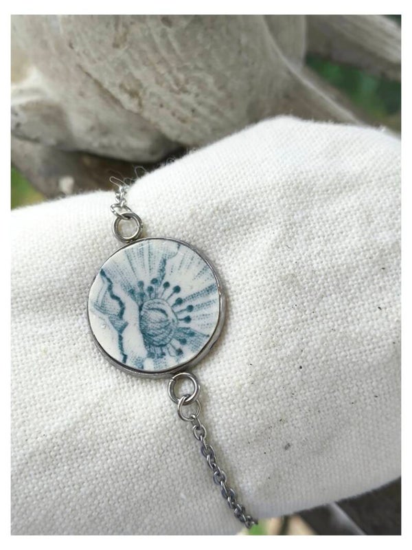 Le bracelet Noa est une pièce unique façonnée à partir d’un véritable fragment de faïence ancienne en terre de fer, issue d’une assiette ancienne décorée de pavots bleus.