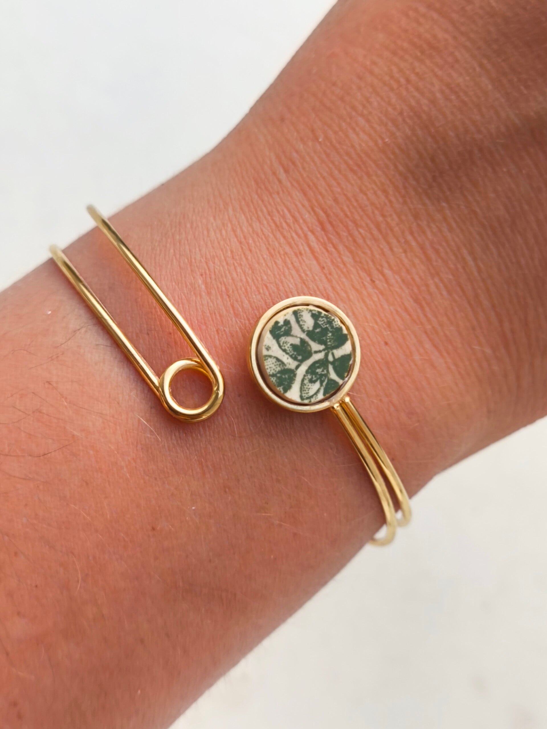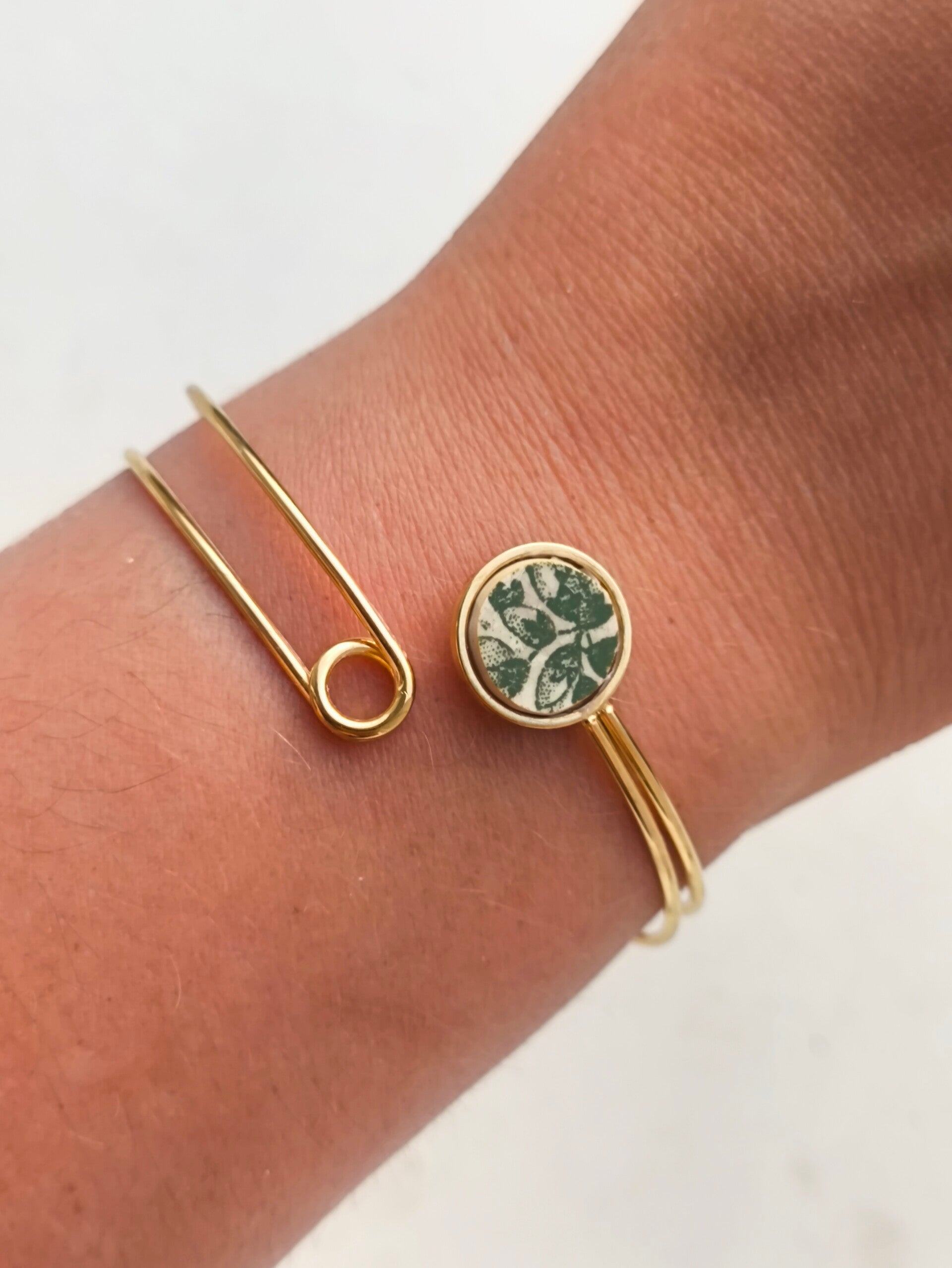 Réalisé à partir d’un éclat de faïence de Sarreguemines (modèle Géraniums verts), ce bracelet unique capture l’âme d’un objet ancien pour la faire rayonner au présent.