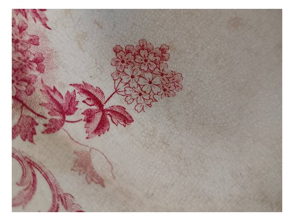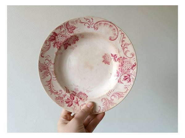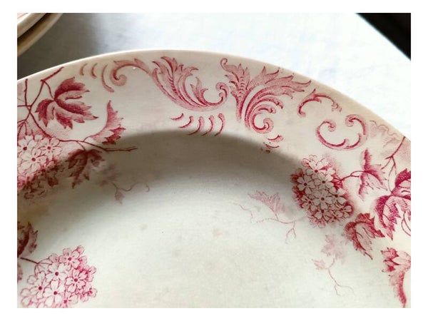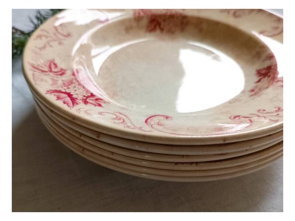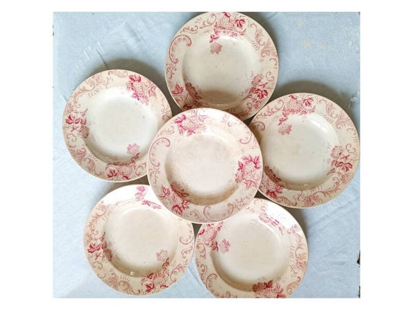 Six assiettes creuses Boules de neige rose , Saint Amand Hamage, faïence terre de fer