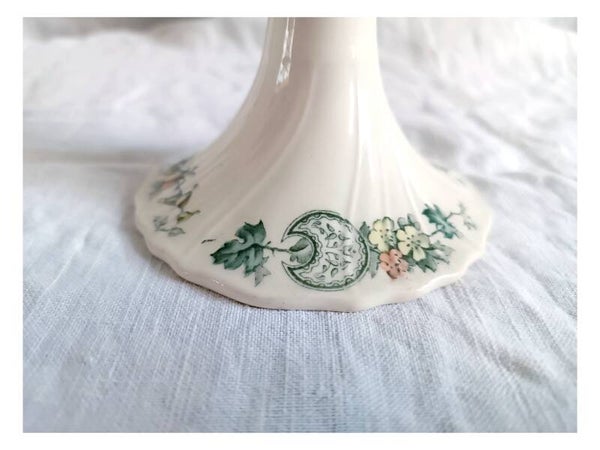Son décor se déploie du centre de la coupe jusqu'au piédouche. Des motifs floraux colorés alternent avec d'élégantes forme de croissants. Le tout est rehaussé de fins liserés en relief.