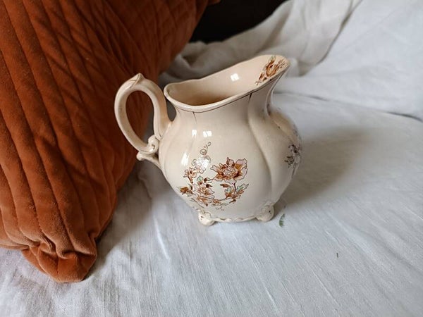 Un décor exquis de fleurs aux tonalités mauve , rose et sépia . Chaque fleur est traitée avec une grande délicatesse . Le pot à lait est surmonté sur quatre petits pieds.