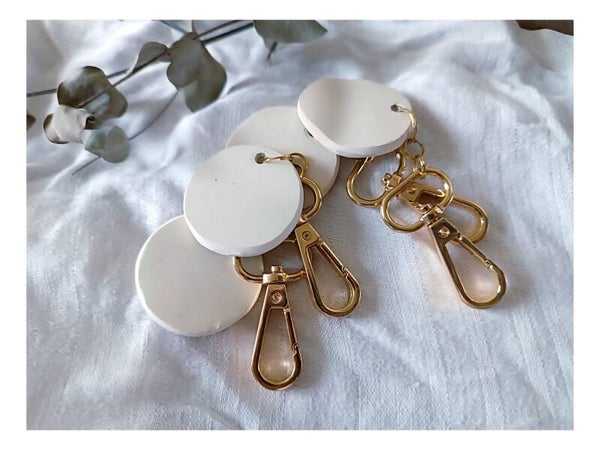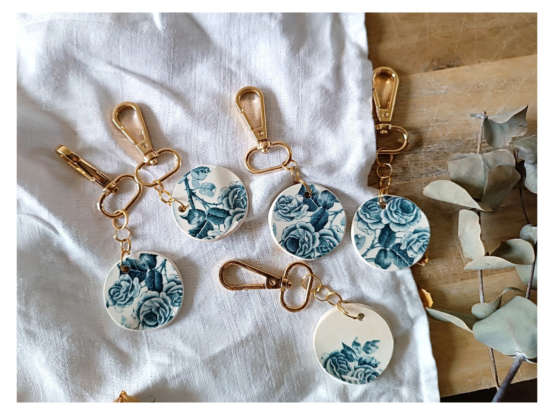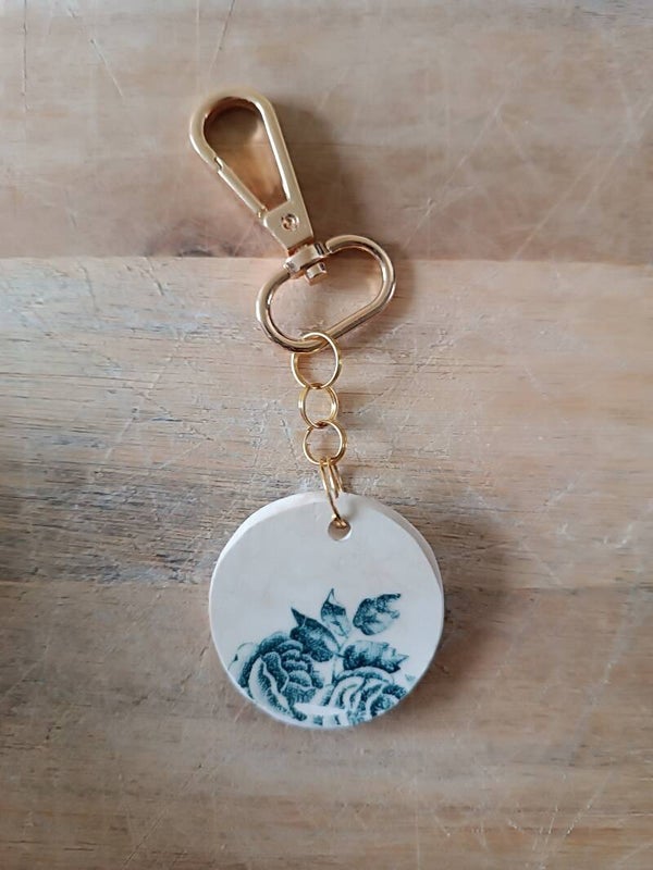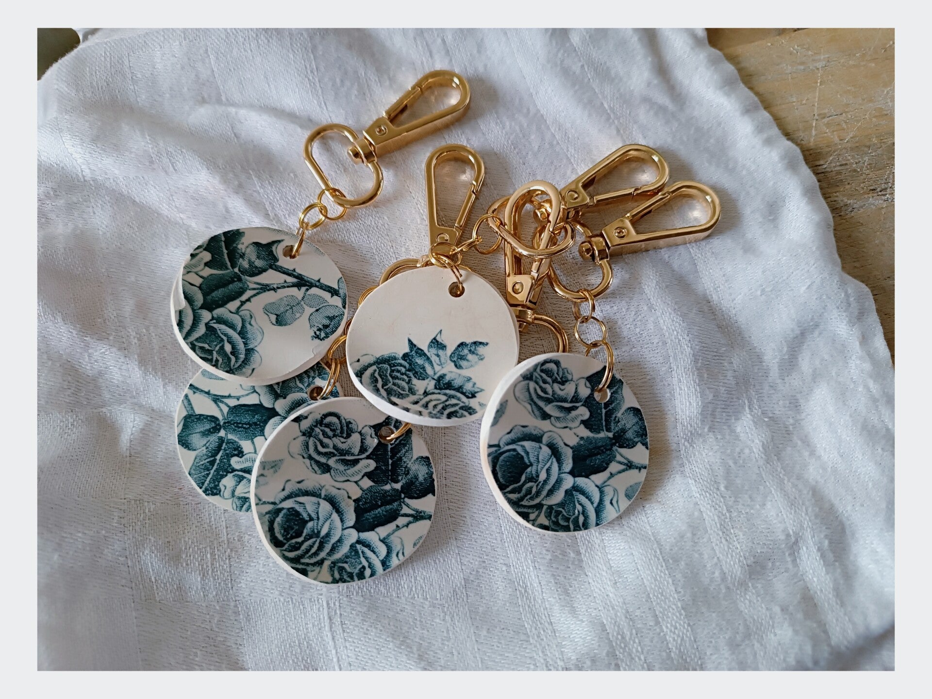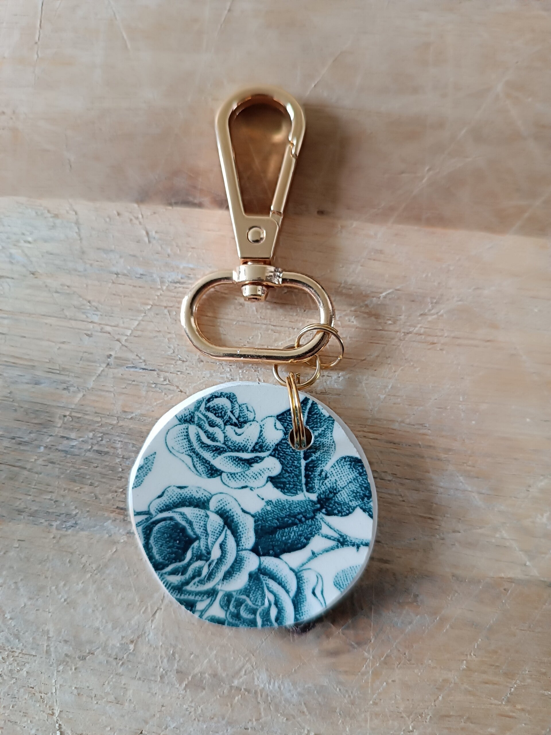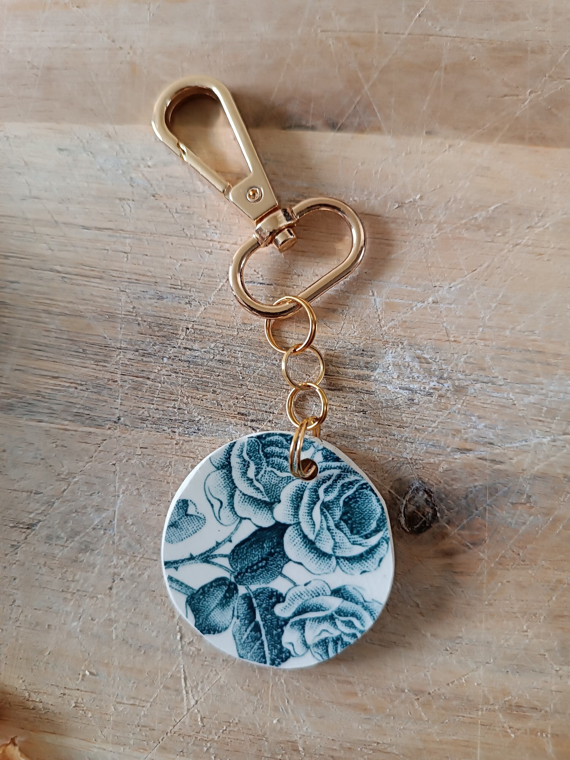 Porte-clé medaillon Roses bleues en faïence terre de fer recyclée Hippolyte Boulenger, manufacture de Choisy le roi .