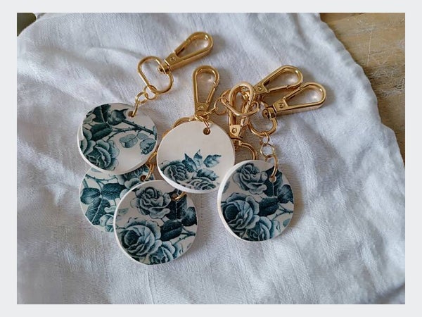 Porte-clé medaillon , Roses bleues , Choisy le Roi Hippolyte Boulenger terre de fer recyclée