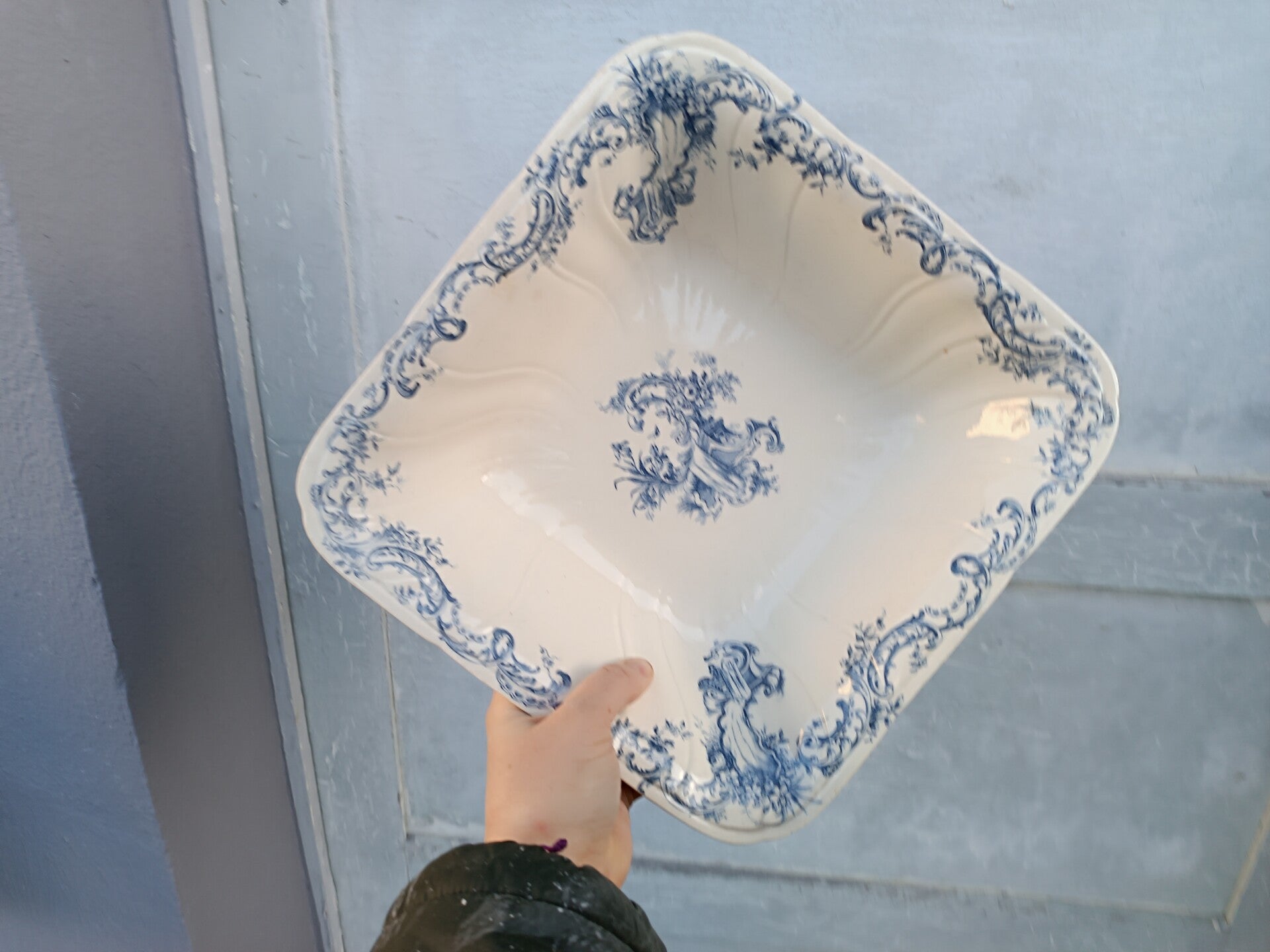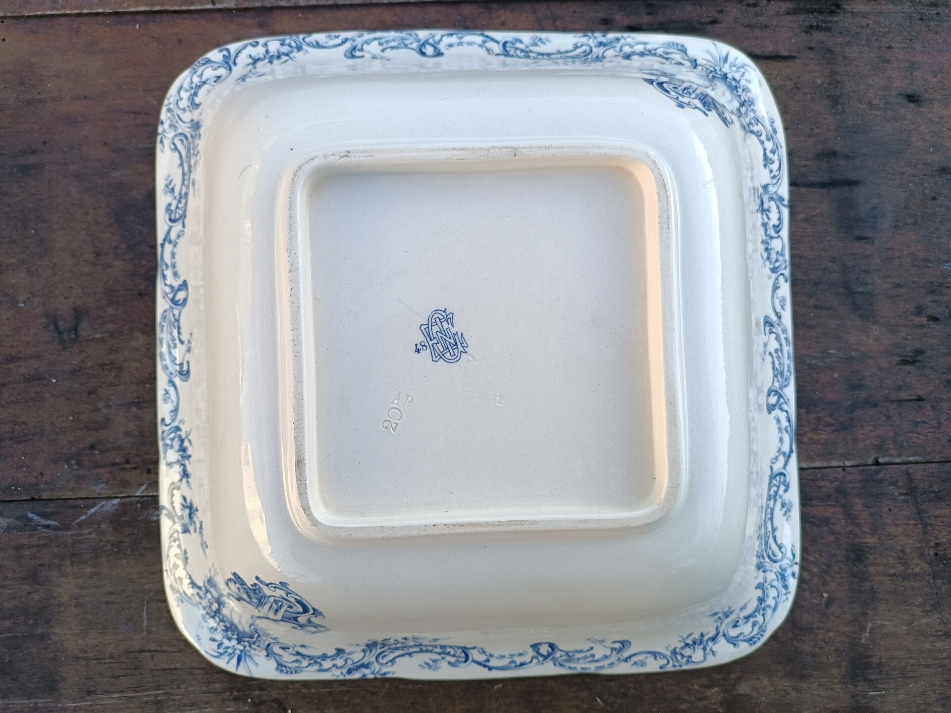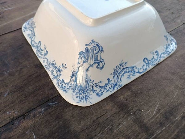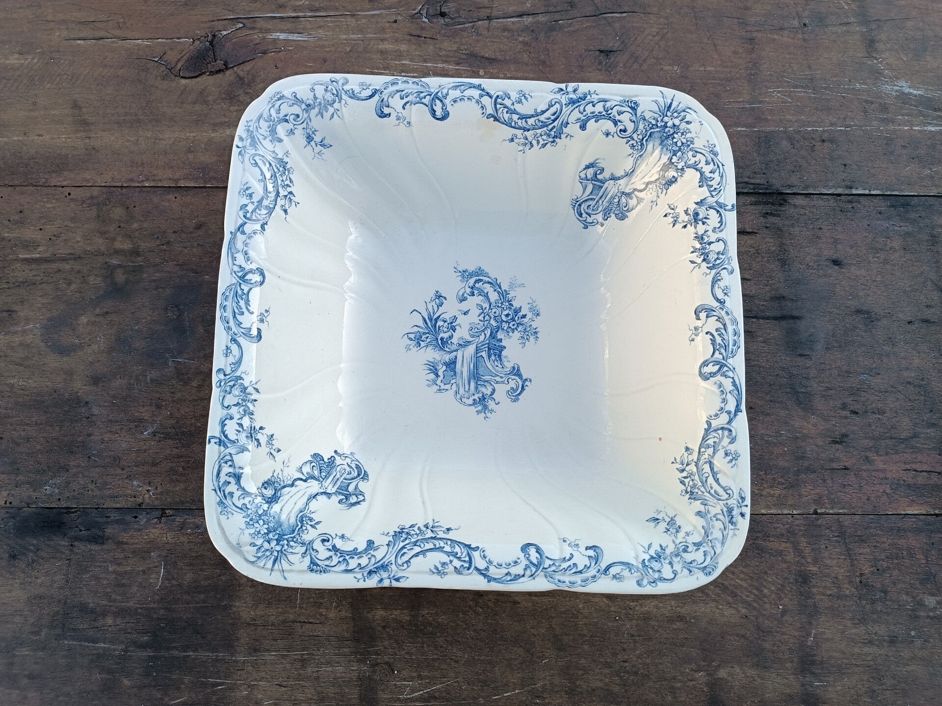 Grand saladier carré , Gien décor Baroque bleu , faïence terre de fer
