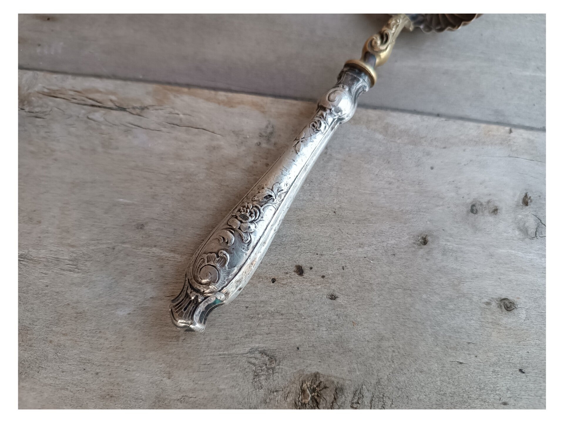 Le manche est travaillé en relief de feuillages et entrelacs . Sur le cuilleron ajouré, on retrouve de légères fleurs .