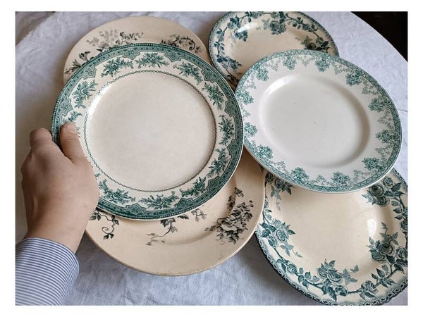 - Une assiette décor roses-mousses de la faiencerie Onnaing . Délicat décor vert de roses et guirlandes ornementales .